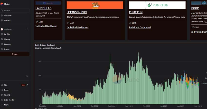 [Dune](https://dune.com/) is a powerful blockchain explorer that allows users to create and explore custom dashboards. For Solana traders, Dune can be used to:
